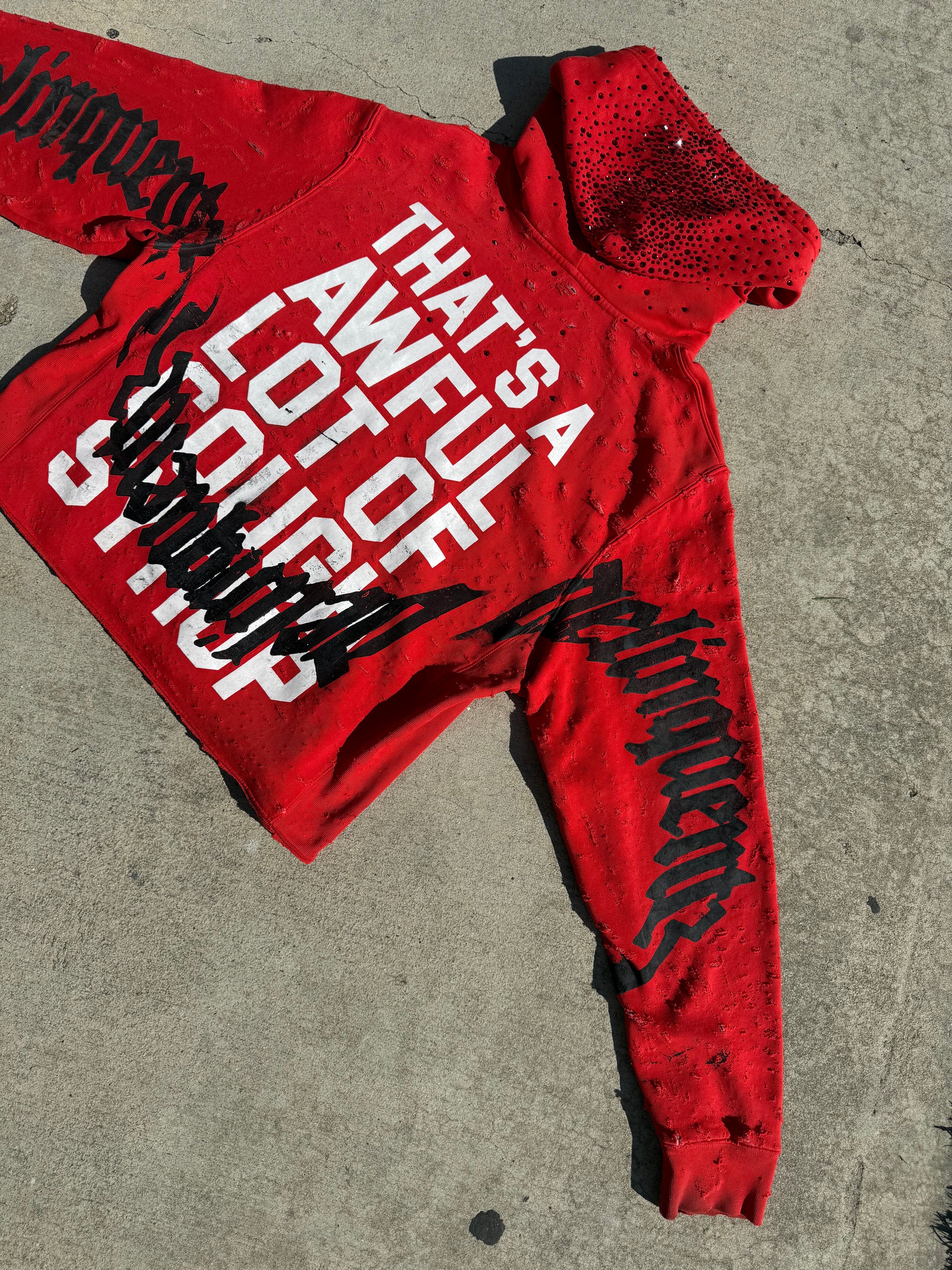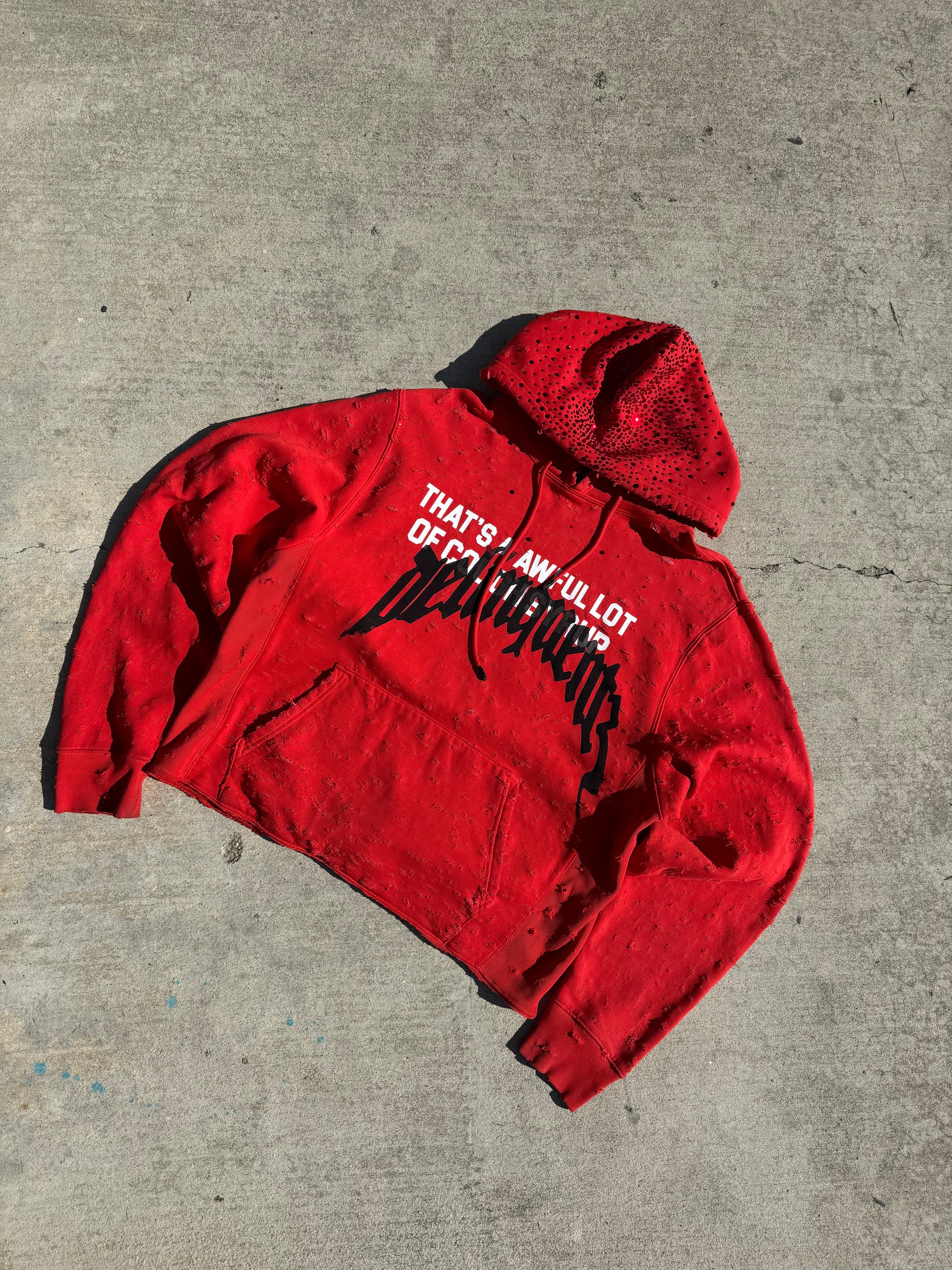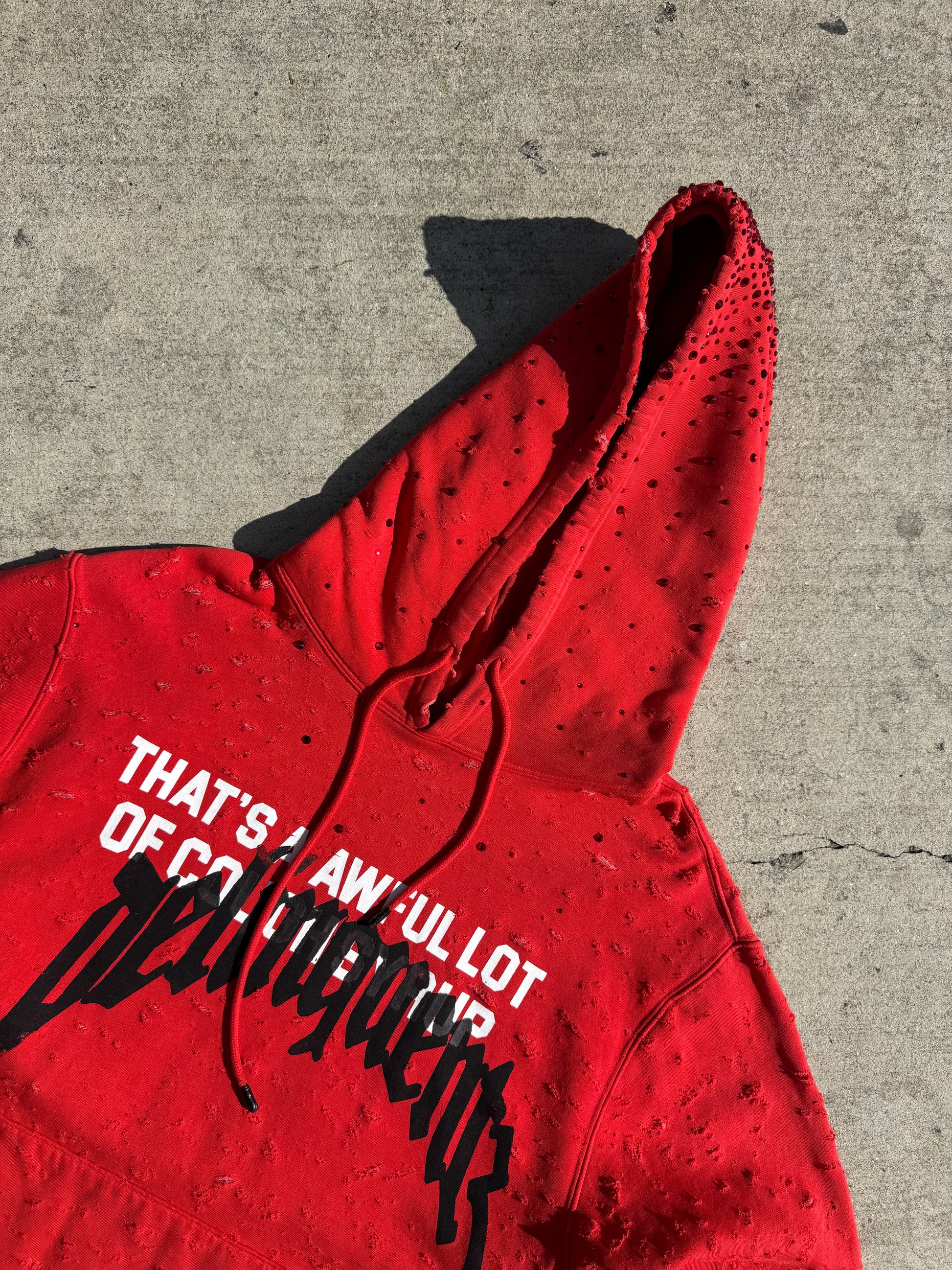 Hand distressed, slight crop, red stone hood, faded, printed on a ALOCS Made hoodie