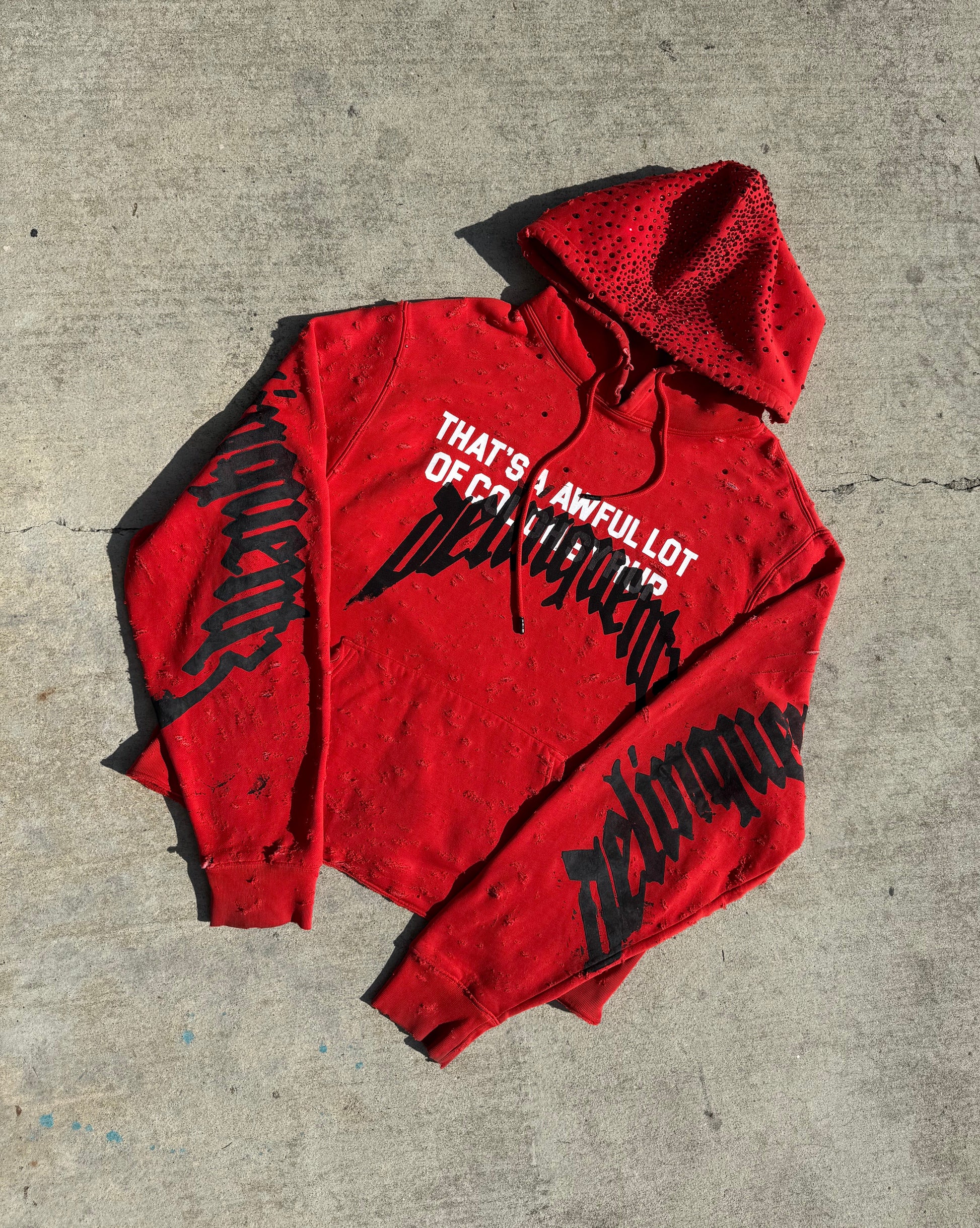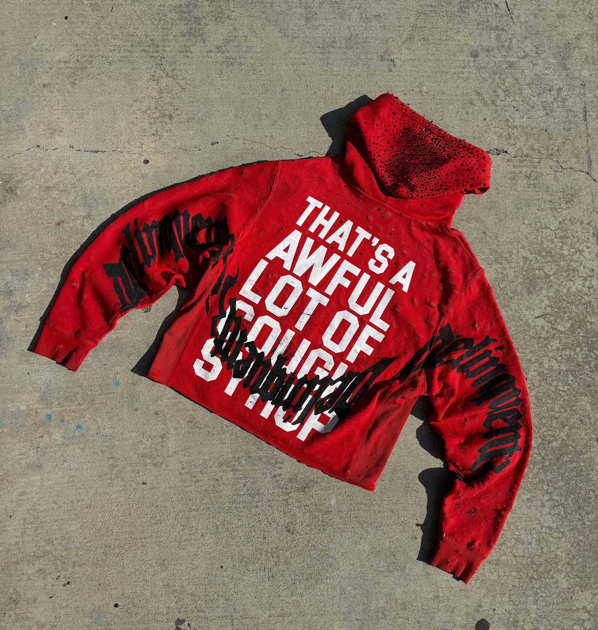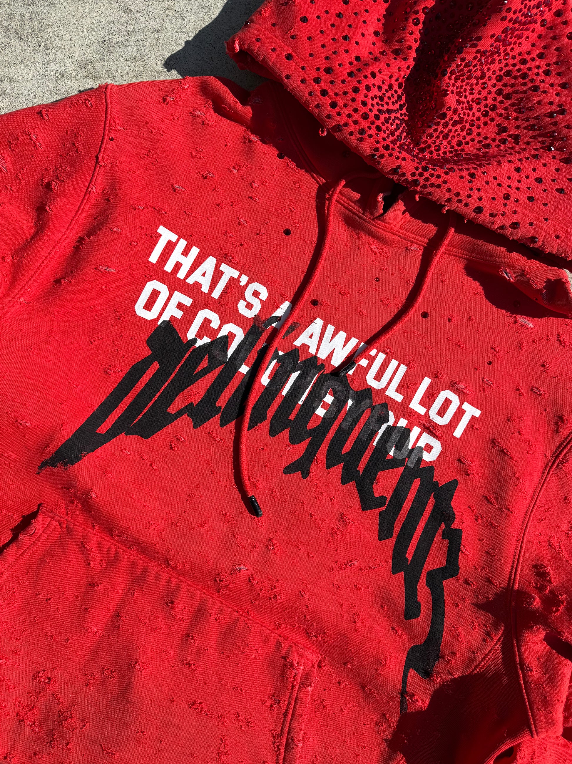 Hand distressed, slight crop, red stone hood, faded, printed on a ALOCS Made hoodie